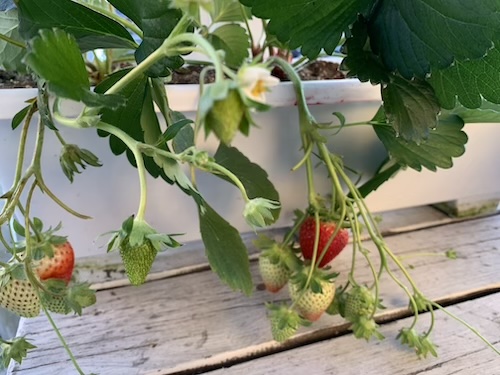1つはもうすぐにでも食べられそうな赤いイチゴがついています。