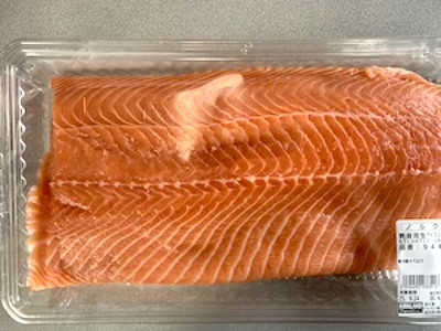 お目当ては、刺身用アトランティックサーモンフィレ ー 水揚げから一度も冷凍することなく、ノルウェーから空輸しています。通常499/100g→399/100g